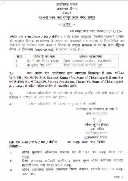 रायपुर। प्रदेश के जनसंपर्क विभाग के दो सहायक संचालकों को उप संचालक के पद पर पदोन्नत किया...