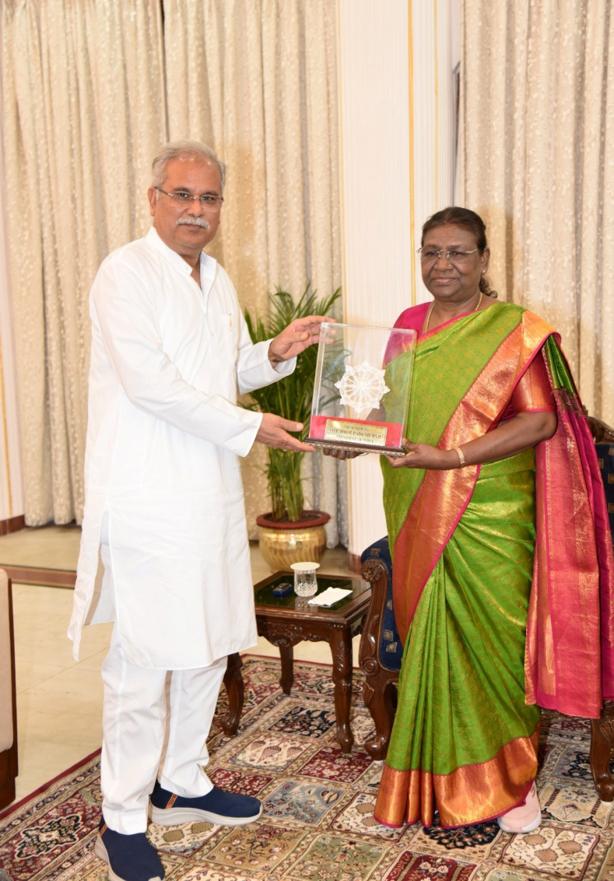 राष्ट्रपति श्रीमती द्रौपदी मुर्मु के छत्तीसगढ़ के प्रवास के दौरान यहां मुख्यमंत्री श्री भूपेश बघेल ने उन्हें छत्तीसगढ़ की विशिष्ट पहचान कोसा के वस्त्र भेंट किए। साथ ही उन्होंने राज्य के मिलेट्स कोदो, कुटकी, रागी, ज्वार आदि से तैयार उत्पाद और बस्तर के बेल मेटल से निर्मित कलाकृति भी राष्ट्रपति श्रीमती मुर्मु को भेंट की। राष्ट्रपति श्रीमती मुर्मु ने श्री बघेल को ‘राष्ट्रपति भवन चित्रित‘ काष्ठ कलाकृति और स्मृति चिन्ह भेंट किया।