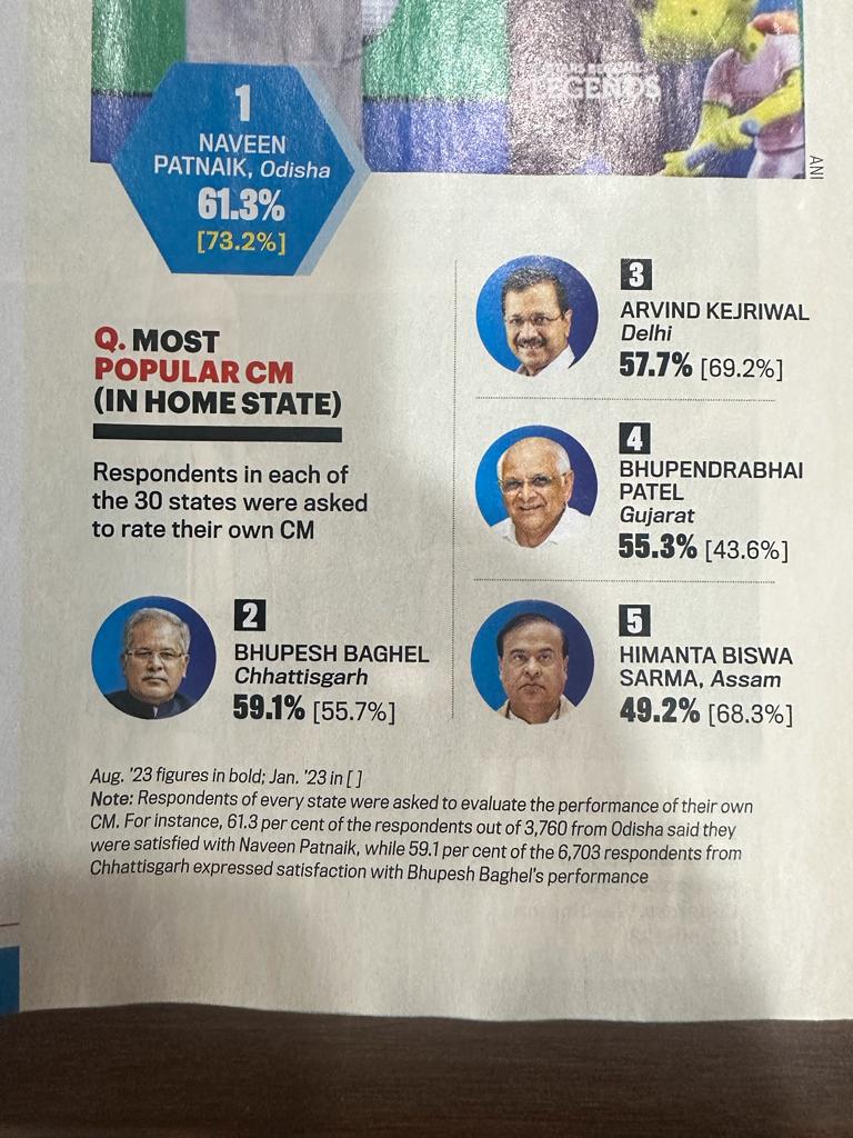 छत्तीसगढ़ सरकार की किसान हितैषी एवं आम जनता की भलाई के लिए संचालित योजनाओं से शहर से लेकर ग्रामीण क्षेत्र के बड़े तबके में जबरदस्त खुशहाली आई है जिससे श्री बघेल की लोकप्रियता बढ़ी है। सुदृढ़ ग्रामीण अर्थव्यवस्था से शहरी अर्थव्यवस्था भी समृद्ध हुई है। इसके साथ ही नागरिक सुविधाओं में बेहतरी के लिए किये गये कार्यों से शहरी क्षेत्रों में अच्छा माहौल है जिसका असर भूपेश सरकार की लोकप्रियता में दिख रहा है। सबसे बड़ी बात यह है कि श्री बघेल ने छत्तीसगढ़िया अस्मिता पर लगातार बात की, यह बात लोगों के दिलों में घर कर गई है। वे जनता की भाषा में जनता की रुचि की ही बातें करते हैं इसके चलते उनकी लोकप्रियता में जबरदस्त इजाफा हो रहा है। इंडिया टूडे के सर्वे में लोकप्रियता के मामले में ओडिशा के मुख्यमंत्री पहले स्थान पर, दिल्ली के मुख्यमंत्री तीसरे स्थान पर हैं। गुजरात के मुख्यमंत्री चौथे, असम के मुख्यमंत्री पांचवे स्थान पर हैं।