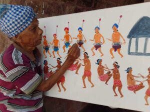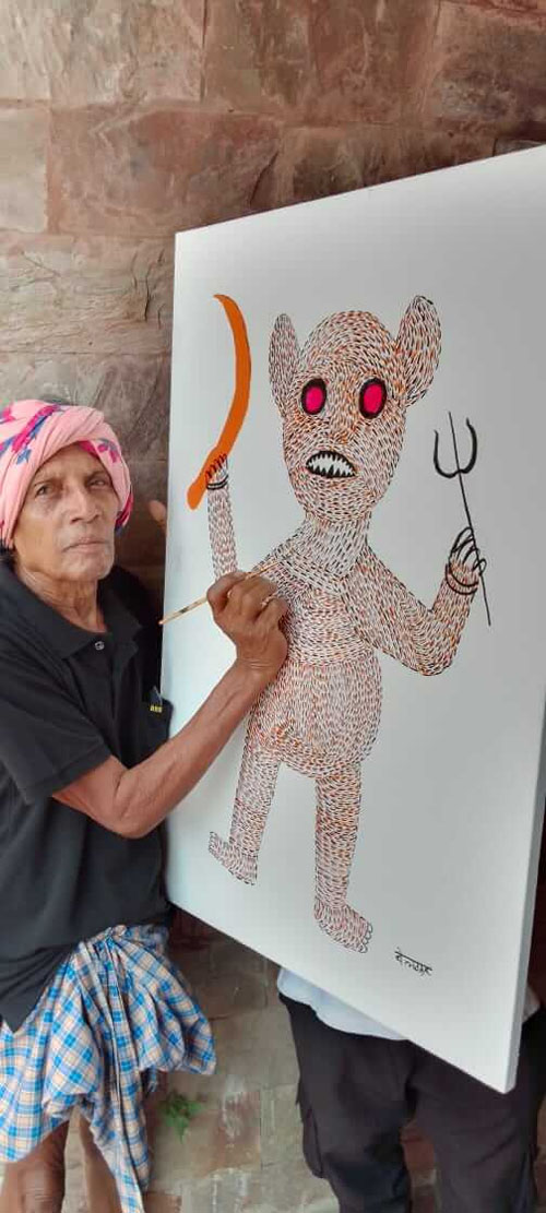 गढ़ बंगाल नारायणपुर के रहने वाले 63 वर्षीय जयराम मंडावी पेशे से किसान हैं लेकिन चित्रकला में खूब रमे रहते हैं। आमतौर पर वह आदिवासियों के रोजमर्रा के जीवन को अपने चित्रों में उकेरना ज्यादा पसंद करते है। यहां तैयार हो रही उनकी पेंटिंग में माता का डोला ले जाते हुए ग्रामीण दिख रहे हैं।विभिन्न आदिवासी त्यौहार एक ही कैनवास पर कार्यशाला में शामिल 24 वर्षीय युवा आदिवासी चित्रकार बलदेव मंडावी इंदिरा कला संगीत विश्वविद्यालय में ललित कला अंतिम वर्ष के मास्टर ऑफ फाइन आर्ट के छात्र हैं। बहुमुखी प्रतिभा के धनी बलदेव विभिन्न विषयों पर अपनी चित्रकारी करते हैं और विभिन्न आदिवासी त्योहारों को एक ही कैनवास में गढ़ देते हैं।