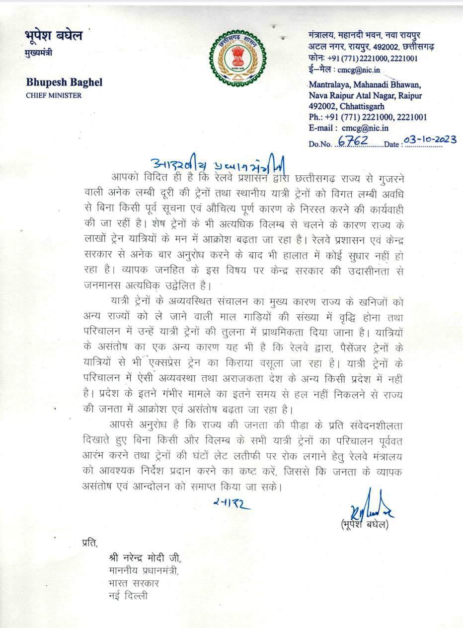 श्री बघेल ने प्रधानमंत्री से अनुरोध किया है कि राज्य की जनता की पीड़ा के प्रति संवेदनशीलता दिखाते हुए बिना किसी और विलम्ब के सभी यात्री ट्रेनों का परिचालन पूर्ववत आरंभ करने तथा ट्रेनों की घंटों लेट लतीफी पर रोक लगाने हेतु रेलवे मंत्रालय को आवश्यक निर्देश प्रदान किया जाए, जिससे कि जनता के व्यापक असंतोष एवं आन्दोलन को समाप्त किया जा सके।