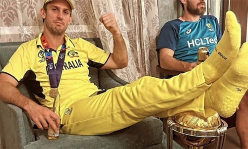 जिसमें वह वर्ल्ड कप 2023 की ट्रॉफी पर पैर रखकर हाथ में ड्रिंक लिए नजर आ रहे हैं। भारतीय फैंस इससे आहत हुए हैं और उनको जमकर लताड़ा जा रहा है। हालांकि, कुछ क्रिकेट फैंस का ये भी कहना है कि ये उनका दिन है और उनकी ट्रॉफी है तो वे इसका इस्तेमाल कैसे भी कर सकते हैं। वे चाहें तो इस पर पेशाब कर सकते हैं और इसे पैरों तले कुचल सकते हैं। हालांकि, आमतौर पर ट्रॉफी के साथ इस तरह का बर्ताव करना सही नहीं माना जाता। हमने ऑस्ट्रेलिया के ही कई खिलाड़ियों की तस्वीर देखी है, जो उसे सिर से ऊपर रख रहे हैं या चूम रहे हैं।