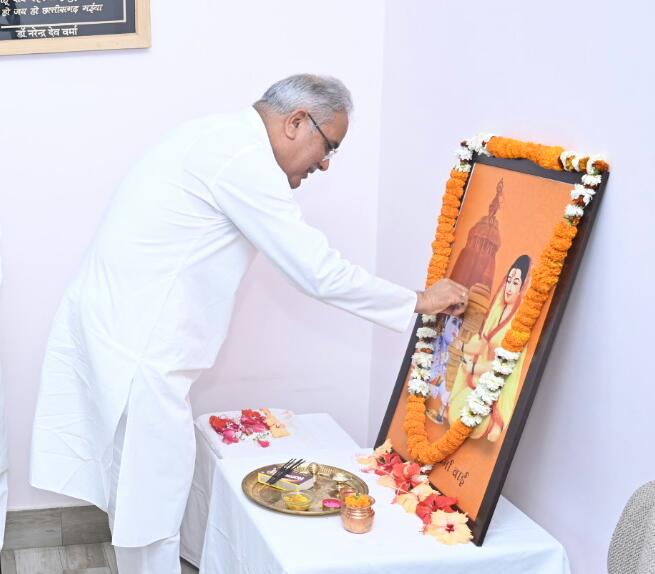 मुख्यमंत्री श्री भूपेश बघेल ने आज यहाँ अपने निवास कार्यालय में भक्त माता कर्मा जयंती पर उनके छायाचित्र पर पुष्प अर्पित कर उन्हें नमन किया । उन्होंने प्रदेशवासियों को भक्त माता कर्मा जयंती की बधाई एवँ शुभकामनाएं दी तथा माता कर्मा से प्रदेशवासियों के लिए सुख, समृद्धि और खुशहाली की कामना की । इस अवसर पर गृह मंत्री श्री ताम्रध्वज साहू, उद्योग मंत्री श्री कवासी लखमा, महिला एवँ बाल विकास मंत्री श्रीमती अनिला भेंडिया, छत्तीसगढ़ तेलघानी विकास बोर्ड के अध्यक्ष श्री संदीप साहू, लोकगायिका सुश्री आरु साहू भी उपस्थित थीं ।