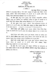 रायपुर :- प्रदेश में सरकार बदलने के बाद अधिकारियों के तबादले का दौर जारी है. इस बीच कई जिले के कलेक्टर बदल दिए गए हैं. जारी आदेश के मुताबिक कुल 6 अधिकारियों का तबादला किया गया है. जिसका आदेश सामान्य प्रशासन विभाग के सचिव कमलप्रीत सिंह ने जारी किया है. जारी आदेश के मुताबिक, सारंगगढ़-बिलाईगढ़ के कलेक्टर कुमार लाल चौहान को बलौदाबाजार-भाटापारा का कलेक्टर बनाया गया है. इसके अलावा आईएएस धर्मेश साहू को सारंगगढ़-बिलाईगढ़ का कलेक्टर बनाया गया है. आईएएस चंदन कुमार को स्वास्थ्य एवं परिवार कल्याण विभाग में विशेष सचिव बनाया गया है. आईएएस प्रियंका ऋषि महोबिया को संचालक पंचायत विभाग की जिम्मेदारी सौंपी गई है. आईएएस लीना कमलेश मंडावी को कलेक्टर गौरेला-पेंड्रा-मरवाही बनाया गया है. इसके अलावा आईएएस प्रतीक जैन को सीईओ आरडीए की जिम्मेदारी सौंपी गई है.