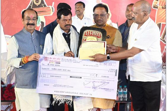 मुख्यमंत्री श्री साय ने जगार-2024 के शुभारंभ समारोह में राज्य के पांच सिद्धहस्त शिल्पियों को राज्य स्तरीय पुरस्कार वर्ष 2021-22 से सम्मानित किया। इनमें बेलमेटल शिल्पी सुंदरलाल झारा ग्राम एकताल पोस्ट नेतनगर, विकासखण्ड पुसौर जिला रायगढ़, समीप विश्वकर्मा लौह शिल्पी ग्राम किड़ईछेपड़ा (ड़ोगरीगुड़ा) पोस्ट पलारी जिला कोण्डागांव-बस्तर, मन्धर कश्यप काष्ठ शिल्पी ग्राम भोण्ड (पाण्डूपारा) पोस्ट लामकेर जिला बस्तर, बृहस्पति जायसवाल गोदना शिल्पी ग्राम मुनगाडीह पोस्ट पाली जिला कोरबा और बाबी सोनवानी भित्तीचित्र शिल्पी ग्राम सिरकोतंगा पोस्ट लहपटरा विकासखण्ड लखनपुर जिला सरगुजा को साल, श्रीफल, प्रमाण-पत्र, स्मृति चिन्ह और 25-25 हजार रूपए का चेक प्रदान कर सम्मानित किया। इस अवसर पर अतिथियों द्वारा सिद्धहस्त शिल्पियों को प्रदान किए गए राज्य स्तरीय पुरस्कार की स्मारिका का विमोचन भी किया गया।