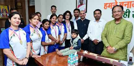 रायपुर :- इंडो-नेपाल योगा कॉम्पीटीशन में गोल्ड मैडल हासिल करने वाली छत्तीसगढ़ की योग टीम ने मुख्यमंत्री श्री विष्णु देव साय से उनके निवास कार्यालय में सौजन्य मुलाकात की। मुख्यमंत्री श्री साय ने कहा कि योग टीम के गोल्ड मैडल हासिल करना छत्तीसगढ़ के लिए गर्व का विषय है, उन्होने टीम के सदस्यों को अपनी बधाई और शुभकामनाएं दी। खेल एवं युवा कल्याण मंत्री श्री टंक राम वर्मा ने भी छत्तीसगढ़ की योग टीम की प्रदर्शन की सराहना करते हुए बधाई और शुभकामनाएं दी हैं। गौरतलब है कि इस महीने के 9 से 12 मई को नेपाल में आयोजित हुए इंडो-नेपाल योगा कॉम्पीटीशन में छत्तीसगढ़ के 10 सदस्यीय टीम ने हिस्सा लिया था। इस प्रतियोगीता में टीम को गोल्ड मैडल से नवाजा गया है। इस टीम के कोच ज्योति दीपक कुंभारे हैं। योगा टीम में दिव्या जैन, प्रीत साव, पुष्पा साव, धमेश, छाया जैन, हेमलता, हर्षा, क्षमता शामिल हैं।