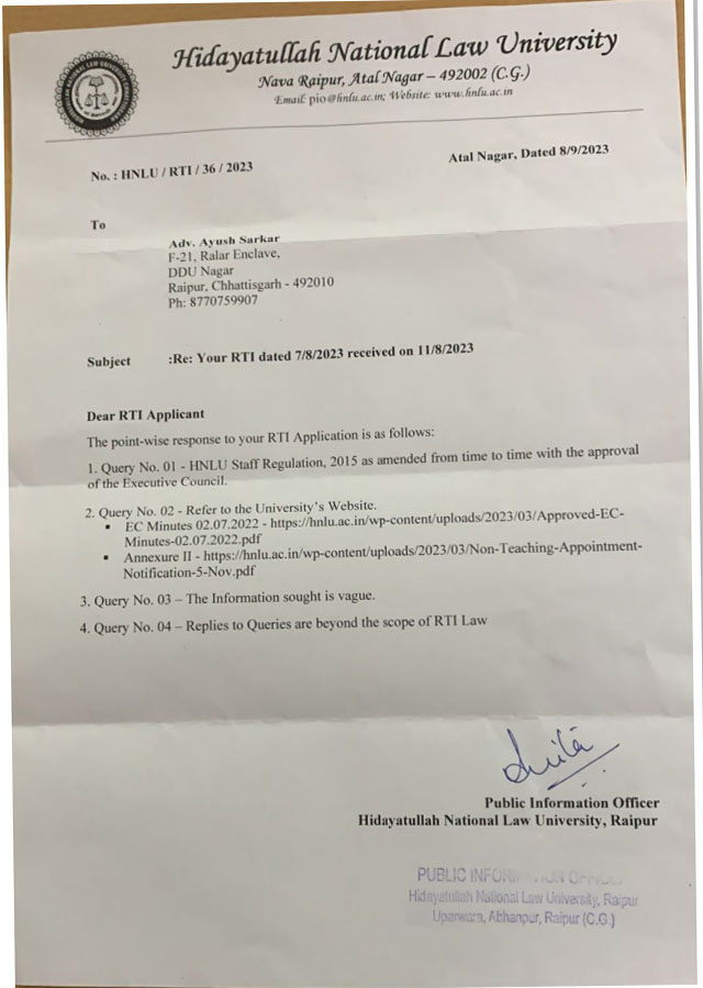 RTI पत्र से मिली जानकारी के अनुसार हिदायतुल्लाह विधि विश्वविद्यालय नवा रायपुर में साल 2022 में नॉन टीचिंग पदों की नियुक्ति में बड़ा खुलासा हुआ है, जिसमें जिसमें एडमिस्ट्रेटिव कम ल्लाइजनिंग ऑफिसर – मनीष तिवारी, पब्लिक रिलेशन ऑफिसर – संगीता मदान रिसायली मिश्रा, असिस्टेंट अकाउंट ऑफिसर – श्रुतिकांत शर्मा, कैंपस सुपरवाइजर – नवरतन सिंग, लाइब्रेरी अटेंडेंट – मंजू कनवर जैसे पर्दों में अपने चहेतों को नियुक्ति देने हेतु भर्ती में घोर अनियमितताएं बरती गई। RTI पत्र से मिली जानकारी के अनुसार विश्वविद्याल के वाइस चांसलर डॉ. वीसी विवेकानन्दम की इस मामलें में पूरी जिम्मेदारी भी बनती है। RTI आवेदन लगाने वाला कोई सामाजिक कार्यकर्ता है जिसका जनता से रिश्ता से कोई संबंध नहीं है जनसरोकार के माध्यम से ये मामला सामने आया है जिसे प्रकाशित किया गया है।