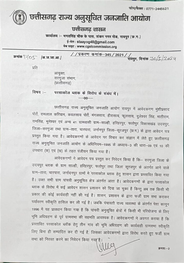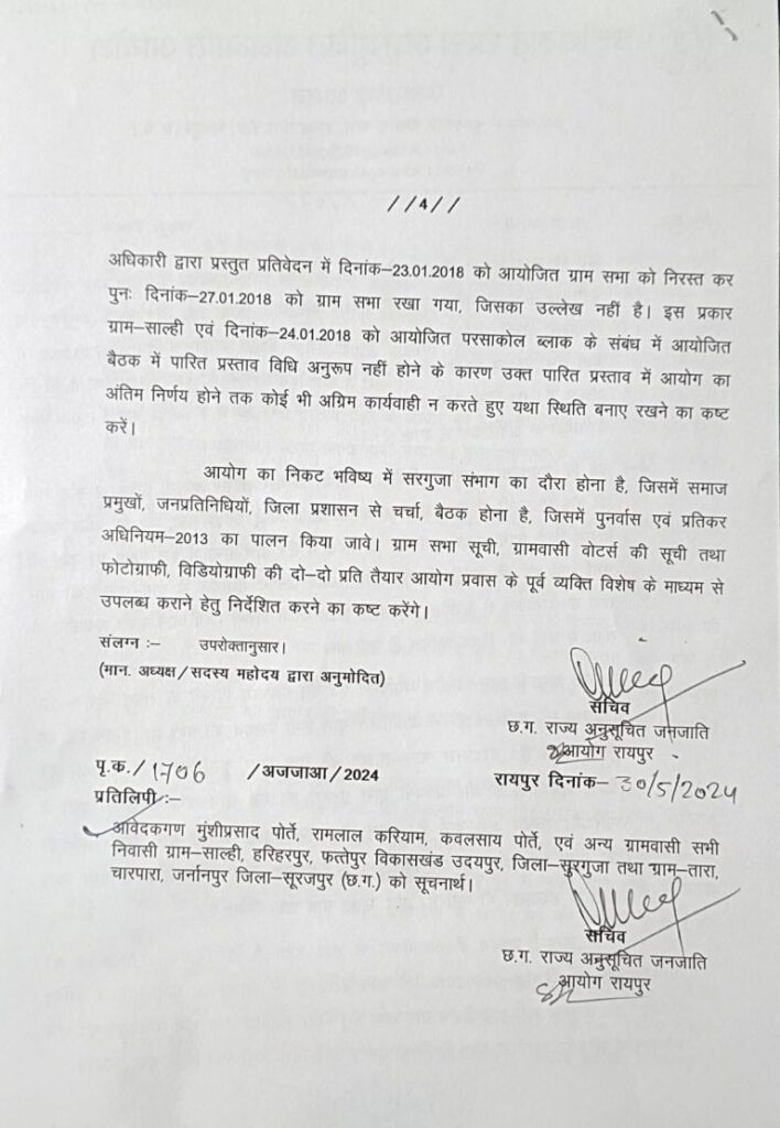 इसके साथ ही आयोग के निकट भविष्य में सरगुजा संभाग का दौरा में समाज प्रमुखों, जनप्रतिनिधियों, जिला प्रशासन से चर्चा, बैठक के मद्देनजर ग्राम सभा सूची, ग्रामवासी वोटर्स की सूची तथा फोटोग्राफी, वीडियोग्राफी की दो-दो प्रति तैयार आयोग प्रवास के पूर्व व्यक्ति विशेष के माध्यम से उपलब्ध कराने के लिए निर्देशित करने कहा है.