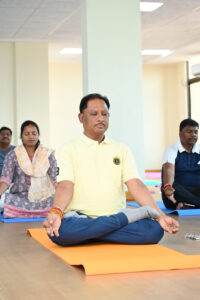 रायपुर :- स्थित भारतीय प्रबंधन संस्थान (आईआईएम) में आयोजित दो दिवसीय चिंतन शिविर के दूसरे दिन आज सुबह मुख्यमंत्री विष्णुदेव साय ने अपने मंत्री मंडल के सहयोगियों के साथ योगाभ्यास किया।