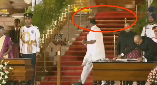 नई दिल्ली :- पीएम नरेंद्र मोदी ने रविवार शाम को राष्ट्रपति भवन में अपने तीसरे कार्यकाल की शपथ ली। इस दौरान उनके साथ 72 मंत्रियों ने भी शपथ ली, जिसके गवाह करीब 6 हजार से ज्यादा मेहमान बने। यही नहीं इस आयोजन के दौरान एक बिन बुलाया मेहमान भी पहुंचा, जिसका वीडियो सोशल मीडिया पर तेजी से वायरल हो रहा है। एक 12 सेकेंड का वीडियो वायरल है, जिसमें शपथ लेकर साइन करते हुए मंत्री दुर्गादास उइके दिख रहे हैं। उनके पीछे सीढ़ियों के ऊपर से एक जंगली जानवर गुजरता दिख रहा है। अब तक साफ नहीं है कि वह कौन सा जंगली जानवर है, लेकिन अनुमान लगाया जा रहा है कि वह तेंदुआ था।