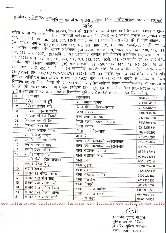 बलोदा बाजार हिंसा :- बलौदा बाजार जिले में सोमवार को हुई हिंसा भड़क गई. सतनामी समाज के स्तंभ को नुकसान पहुंचाने के विरोध में लोगों ने कलेक्टर और एसपी ऑफिस में आग लगा दी. जिसके बाद पूरे जिले में धारा 144 लगा दी गई है. वहीं अब हिंसा की निष्पक्ष जांच के लिए छत्तीसगढ़ पुलिस ने स्पेशल टीम गठित की है. इस टीम में 3 DSP, 7 TI, 8 ASI समेत 6 हेड कॉन्स्टेबल को शामिल किया गया है. बता दें कि धरना प्रदर्शन में आए लोगों ने कलेक्टर और एसपी कार्यालय समेत वहां खड़ी 100 मोटरसाइकिल और 30 से अधिक चार पहिया वाहन में तोड़-फोड़ कर उन्हें आग के हवाले कर दिया था. इस बीच सुरक्षा व्यवस्था में लगे 25 से अधिक पुलिस अधिकारी कर्मचारी एवं प्रशासनिक अधिकारियों को भी चोटें आई है. पुलिस ने धरना प्रदर्शन का आयोजन करने वाले और तोड़फोड़-पत्थर बाजी करते हुए, वाहन और संयुक्त कार्यालय में आगजनी करने वाले 40 से 50 नामजद आरोपियों के खिलाफ विभिन्न धाराओं में 7 एफआईआर दर्ज की है.