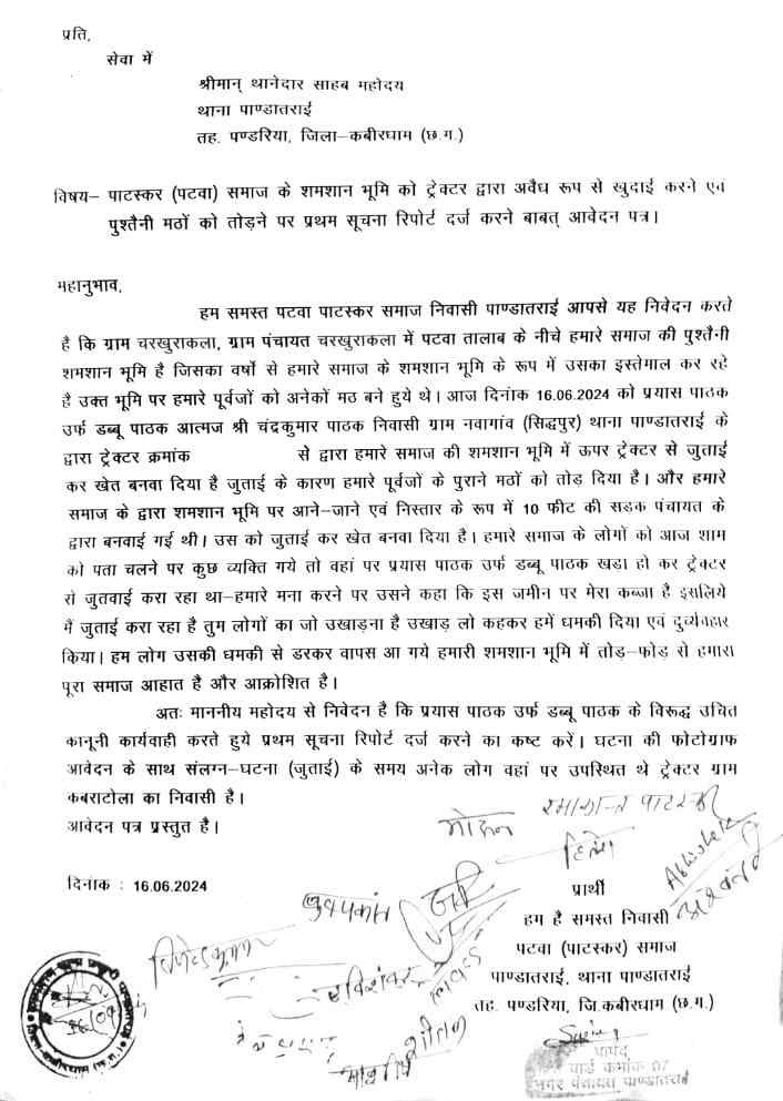 पटवा पाटस्कर समाज के जिला अध्यक्ष हितेश पाटस्कर ने बताया कि कल देर शाम घूमने गया था. उसी दौरान देखा कि प्रयास पाठक उर्फ डब्बू पाठक समाज के चारखुराकला ग्राम पंचायत स्थित समाज के सैकड़ों साल पुराने मुक्तिधाम को ट्रैक्टर से समतल कराकर खेत बनाने का काम कर रहा है, जिसमें पूर्वजों के अनेकों मठों पर ट्रैक्टर चला दिया गया है. पूर्वजों के अपमान पर समाज के लोग एक होकर पांडातराई थाना में शिकायत दर्ज कराने पहुंचे थे.