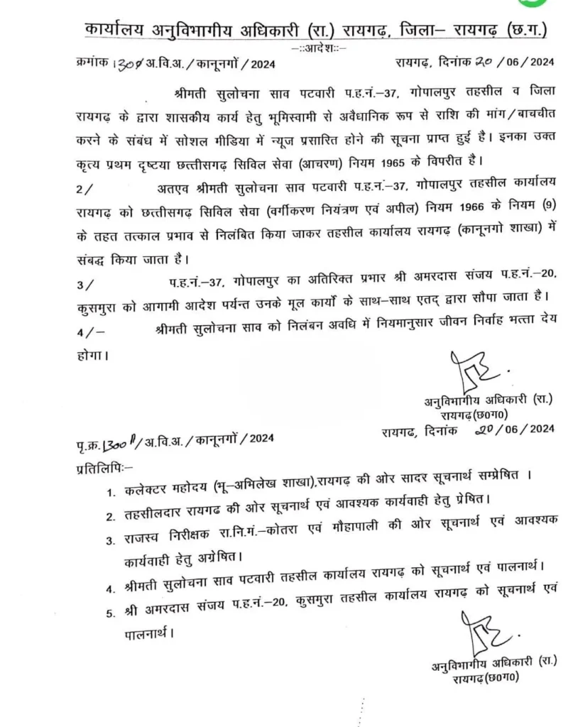 एसडीएम द्वारा जारी आदेश के अनुसार, सुलोचना साव पटवारी (प.ह.नं.-37, गोपालपुर, तहसील एवं जिला रायगढ़) के खिलाफ सोशल मीडिया पर न्यूज प्रसारित हुई कि उन्होंने शासकीय कार्य हेतु भूमिस्वामी से अवैधानिक रूप से राशि की मांग की है। यह कृत्य छत्तीसगढ़ सिविल सेवा (आचरण) नियम 1965 के विपरीत पाया गया है। इसलिए, छत्तीसगढ़ सिविल सेवा (वर्गीकरण, नियंत्रण एवं अपील) नियम 1966 के नियम (9) के तहत सुलोचना साव को तत्काल प्रभाव से निलंबित कर तहसील कार्यालय रायगढ़ (कानूनगो शाखा) में संबद्ध किया गया है। साथ ही, प.ह.नं.-37, गोपालपुर का अतिरिक्त प्रभार अमरदास संजय (प.ह.नं.-20, कुसमुरा) को उनके मौलिक कार्यों के साथ सौंपा गया है। निलंबन की अवधि के दौरान, श्रीमती सुलोचना साव को नियमानुसार जीवन निर्वाह भत्ता देय होगा।