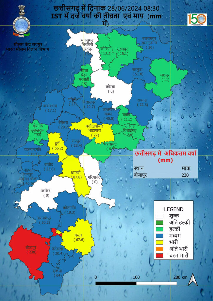 मौसम की मानें तो एक चक्रीय चक्रवाती परिसंचरण उत्तर पश्चिम बंगाल की खाड़ी के ऊपर 1.5 किमी से 5.8 किमी ऊंचाई तक फैला है। यही वजह है कि मौसम विभाग ने बस्तर और रायपुर संभाग में बारिश की चेतावनी जारी की है। मौसम विभाग के मुताबिक बीजापुर जिले में भारी बारिश हो सकती है। इसके अलावा बलौदा बाजार, दुर्ग, धमतरी और बस्तर के लिए येलो अलर्ट जारी किया गया है। वही कल 29 जून को उत्तर छत्तीसगढ़ में भी बारिश के आसार है।