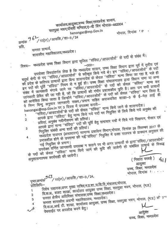 भोपाल :- मध्य प्रदेश में उच्च शिक्षा विभाग ने सभी सरकारी कॉलेजों से कर्मचारियों की नियुक्ति की जानकारी मांगी है। दरअसल, नियमों की अनदेखी कर संविदा कर्मियों की जगह आउटसोर्स कर्मचारी को परमानेंट किया गया है। प्राचार्य ने 7 हजार कर्मचारियों को स्थाई किया है। इसे लेकर अब आयुक्त ने जानकारी मांगी है। प्रदेश के सरकारी कॉलेजों में संविदा कर्मियों की जगह आउटसोर्स कर्मचारियों की नियुक्त की गई। यह जानकारी उच्च शिक्षा विभाग ने एमपी विधानसभा के मानसून सत्र में दी। जिसके आधार पर आयुक्त ने कॉलेजों के प्राचार्यों से जानकारी मांगी है। उन्होंने दिन के अंदर प्रिंसिपलों को जानकारी देने के लिए कहा है।