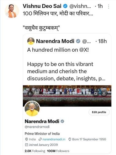 मुख्यमंत्री विष्णुदेव साय नें प्रधानमंत्री नरेंद्र मोदी के 100 मिलियन फॉलोवर्स होने पर अपने एक्स हैंडल पर लिखा ‘100 मिलियन पार, मोदी का परिवार “वसुधैव कुटुम्बकम्”। प्रधानमंत्री नरेंद्र मोदी 100 मिलियन से अधिक फॉलोअर्स के साथ सबसे अधिक फॉलो किए जाने वाले वैश्विक नेता बन गए हैं।