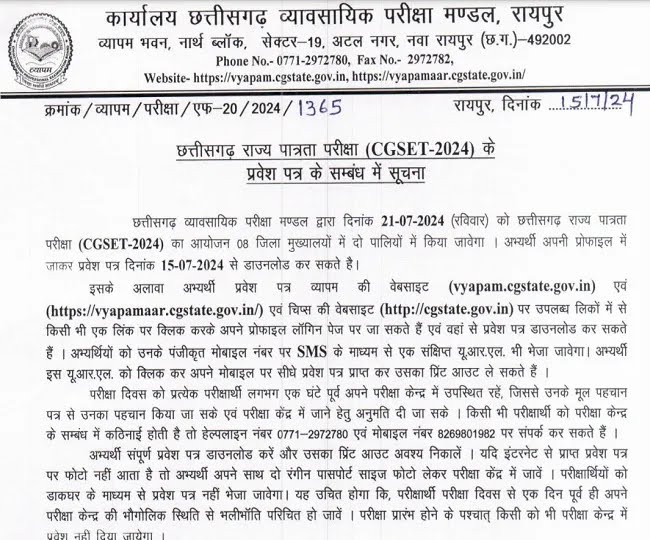 CG SET एडमिट कार्ड 2024 :- छत्तीसगढ़ व्यावसायिक परीक्षा मण्डल ने राज्य पात्रता परीक्षा (SET) का एडमिट कार्ड आधिकारिक वेबसाइट vyapam.cgstate.gov.in पर जारी कर दिया है. अभ्यर्थी यहां दी गई डायरेक्ट लिंक से सीजी एसईटी एडमिट कार्ड 2024 डाउनलोड कर सकते हैं. बोर्ड द्वारा राज्य पात्रता परीक्षा का आयोजन 21 जुलाई को राज्य के विभिन्न केंद्रों पर किया जाएगा. यह परीक्षा सुबह 9:30 बजे से 12:30 बजे तक और दोपहर 2 बजे से शाम 5 बजे तक होगी. सीजी एसईटी के राज्य स्तरीय परीक्षा है, जिसके तहत दो पेपर हैं. सीजी एसईटी के पहले पेपर में 100 अंकों के 50 सवाल और दूसरे पेपर में 200 अंकों के 100 सवाल पूछे जाते हैं. बता दें कि इस परीक्षा में निगेटिव मार्किंग का प्रावधान है.