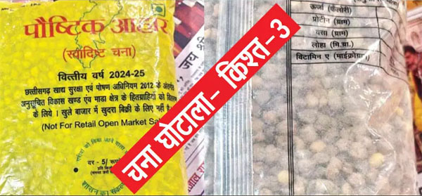रायपुर :- भ्रष्ट अधिकारी और दलाल पीडीएस के तहत हितग्राहियों को चना आपूर्ति में भ्रष्टाचार कर सरकार की साख पर बट्टा लगा रहे हैं। भ्रष्ट अधिकारी और दलाल मिलीभगत कर नैफेड से उच्च क्वालिटी का चना प्राप्त कर बाज़ार से घटिया चना जिसे जानवर के चारे के लिए उपयोग में लिया जाता है को सस्ते दामों पर खऱीद कर छत्तीसगढ़ के गऱीब आदिवासियों को उचित मूल्य की दुकानों के माध्यम से वितरित कर रहे हैं। इसका ठेका चना माफिय़ा पिछले 20 सालों से अलग अलग नामों से ले रहे है।