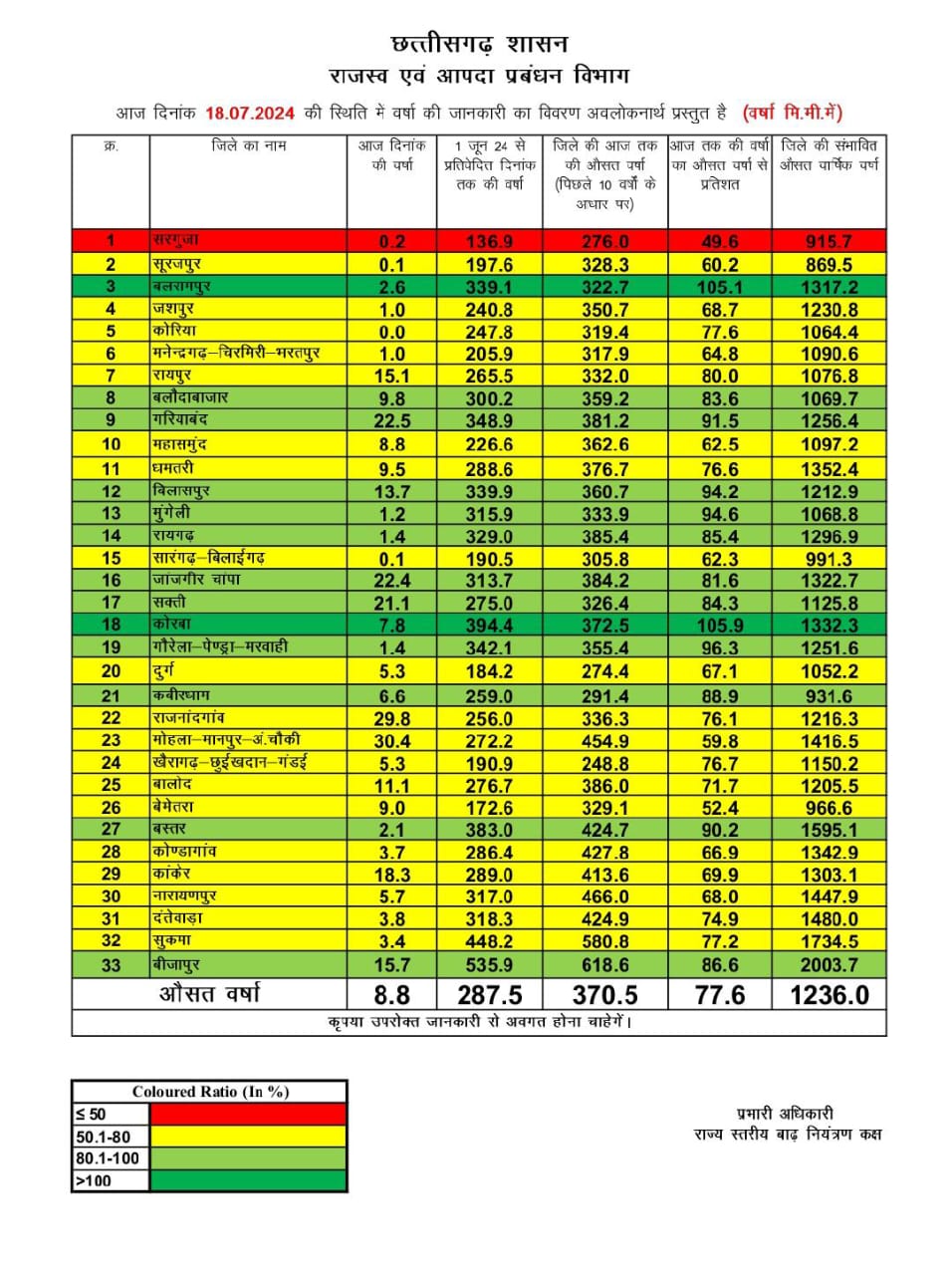 कबीरधाम जिले में 259.0 मिमी, राजनांदगांव में 256.0 मिमी, मोहला-मानपुर-अंबागढ़चौकी में 272.2 मिमी, खैरागढ़-छुईखदान-गंडई में 190.9 मिमी, बालोद में 276.7 मिमी, बेमेतरा में 172.6 मिमी, बस्तर में 383.0 मिमी, कोण्डागांव में 286.4 मिमी, कांकेर में 289.0 मिमी, नारायणपुर में 317.0 मिमी, दंतेवाड़ा में 318.3 मिमी और सुकमा जिले में 448.2 मिमी औसत वर्षा एक जून से अब तक रिकार्ड की गई.