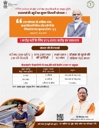 बलौदाबाजार, भारत शासन द्वारा प्रधानमंत्री सूर्य घर मुफ्त बिजली योजना के अंतर्गत देश के एक करोड़ घरों के छतों पर सौर पैनल स्थापना का लक्ष्य रखा गया है। प्रधानमंत्री सूर्य घर मुफ्त बिजली योजना के अंतर्गत प्रति माह 300 यूनिट तक मुफ्त बिजली प्रदान की जाएगी। इसके साथ ही 78000 तक की अधिकतम सब्सिडी तथा सस्ते ब्याज पर लोन भी प्रदान की जाएगी। क्रेडा के जिला प्रभारी ने बताया कि इस योजना के अंतर्गत शहरी स्थानीय निकायों और पंचायतों को भी अपने अधिकार क्षेत्र में छत पर सौर प्रणाली को बढ़ावा देने के लिए प्रोत्साहित किया जाएगा। उन्होंने बताया कि प्रधानमंत्री सूर्य घर मुफ्त बिजली योजना से अधिक आय, कम बिजली और नवीन रोजगार सृजन होगा तथा नवीनीकृत ऊर्जा स्त्रोत के प्रति जागरूकता बढ़ेगी। उन्हांेने बताया कि छतों पर सौर पैनल स्थापना हेतु हितग्राहियों को प्राप्त होने वाले अनुदान के अंतर्गत रूफटाॅप सोलर प्लांट की क्षमता 01 से 02 किलोवाॅट तथा 0 से 150 यूनिट विद्युत खपत होने पर 30 हजार से 60 हजार रूपये की राशि का अनुदान प्रदान की जाएगी। इसी तरह रूफटाॅप सोलर प्लांट की क्षमता 2 से 3 किलोवाॅट तथा 150 से 300 यूनिट विद्युत खपत होने पर 60 हजार से 78 हजार रूपये की अनुदान प्रदान की जाएगी। इसी तरह रूफटाॅप सोलर प्लांट की क्षमता 03 किलोवाॅट तथा 300 यूनिट से अधिक विद्युत खपत होने पर 78 हजार रूपये की अनुदान प्रदान की जाएगी।