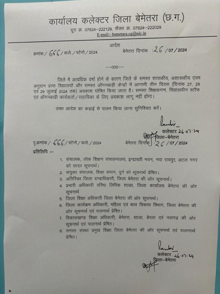 बेमेतरा :- जिले में आगामी तीन दिनों के लिए भारी बारिश का अलर्ट जारी किया गया है. जिला कलेक्टर रणवीर शर्मा ने इस संदर्भ में 27, 28, और 29 जुलाई को सभी शासकीय, अर्ध-शासकीय और निजी स्कूलों के साथ-साथ आंगनबाड़ी केंद्रों में छुट्टी की घोषणा की है. जारी आदेश के अनुसार, बेमेतरा में अत्यधिक वर्षा होने के कारण जिले के समस्त शासकीय, अशासकीय एवम अनुदान प्राप्त विद्यालयों और समस्त आंगनबाड़ी केन्द्रों में आगामी तीन दिवस (दिनांक 27, 28 एवं 29 जुलाई 2024 तक) अवकाश घोषित किया जाता है. समस्त शिक्षकगण, विद्यालयीन स्टॉफ और आंगनबाड़ीकार्यकर्ता/सहायिका के लिए अवकाश लागू नहीं होगा.