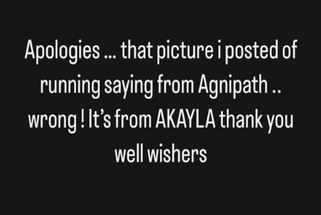 इस पर माफी मांगते हुए उन्होंने पोस्ट में लिखा है, ‘क्षमा करें… अग्निपथ से भागते हुए जो तस्वीर मैंने पोस्ट की थी, वह गलत है. यह अकेला से है, शुभचिंतकों का धन्यवाद.’ बता दें कि अमिताभ बच्चन (Amitabh Bachchan) की फिल्म ‘अकेला’ साल 1991 में आई थी. इस फिल्म को रमेश सिप्पी ने डायरेक्ट किया था ‘अकेला’ में अमिताभ बच्चन (Amitabh Bachchan) के साथ जैकी श्रॉफ, अमृता सिंह और मीनाक्षी शेषाद्रि ने अहम रोल निभाया था.