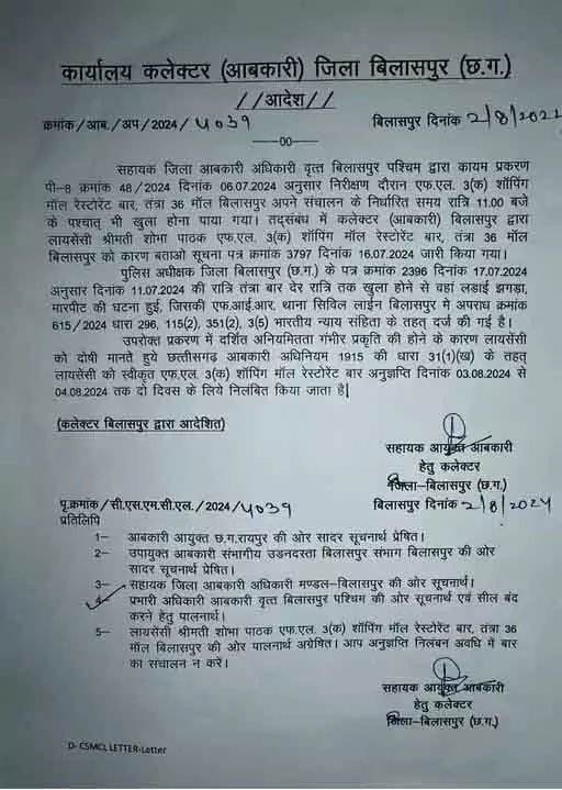 बिलासपुर :- बिलासपुर में आबकारी विभाग ने तंत्रा बार का लाइसेंस 2 दिन के लिए निरस्त किया है। देर रात तक बार खुले होने के कारण आए दिन विवाद होता है। कुछ दिनों पहले नशे में युवकों के बीच मारपीट का मामला सामने आया था। इसकी सूचना पर पहुंची पुलिस ने युवकों के खिलाफ मारपीट का मामला दर्ज कर कार्रवाई की थी। साथ ही इसकी सूचना आबकारी विभाग को दी गई। आबकारी अमले ने देर रात बार का निरीक्षण किया। इस दौरान भी नियमों को ताक पर रखकर बार देर रात तक खुला पाया गया।