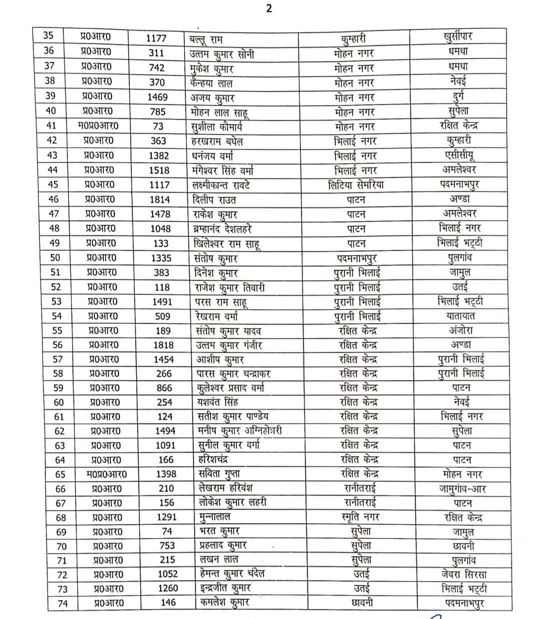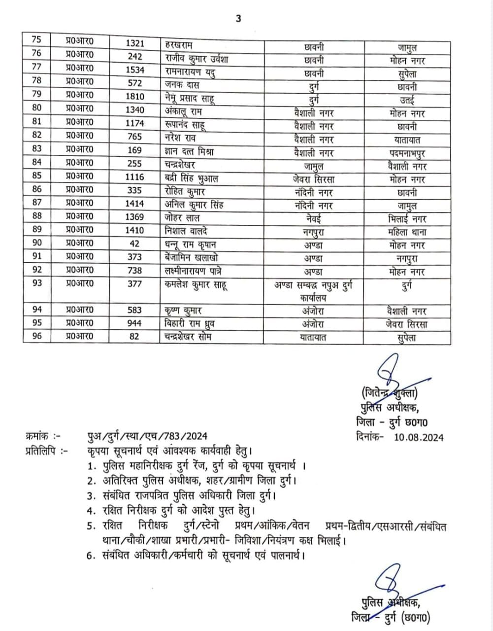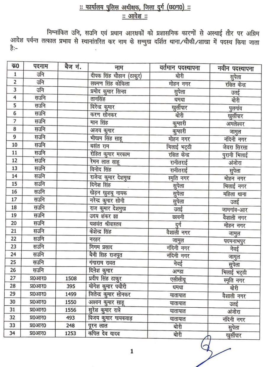 CG पुलिस ट्रांसफर :- छत्तीसगढ़ में आगामी नगरीय निकाय चुनाव के पहले लगातार पुलिस विभाग में तबादलो का दौर जारी है। इसी बीच खबर आई है कि दुर्ग एसपी जितेन्द्र शुक्ला ने जिले में बड़ी प्रशासनिक सर्जरी करते हुए, लंबे समय से एक ही जगह पर तैनात 96 पुलिस कर्मियों का ट्रांसफर आर्डर जारी किया है। आदेश के अनुसार 23 सब इंस्पेक्टर, 3 एएसआई और 70 हवलदारों को इधर से उधर किया गया है। इनमें रक्षित केंद्र के 11 सब इंस्पेक्टरों का नाम भी शामिल है।