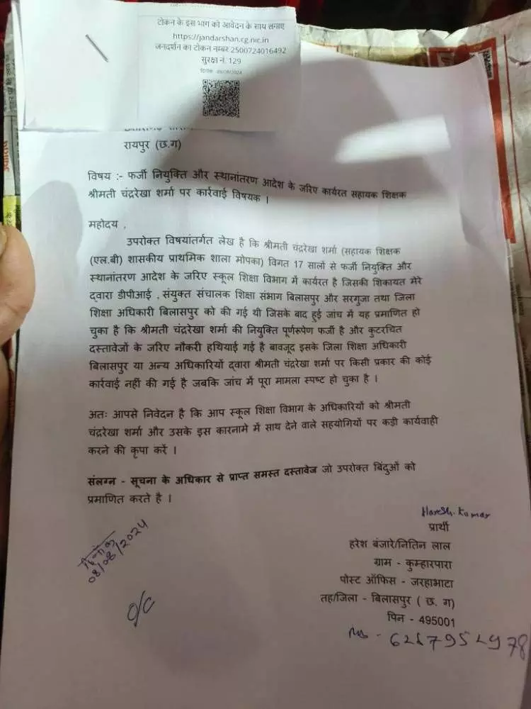 रायपुर :- छत्तीसगढ़ टीचर्स एसोसिएशन के प्रदेश अध्यक्ष संजय शर्मा की धर्मपत्नी, चंद्ररेखा शर्मा की फर्जी नियुक्ति का मामला तूल पकड़ता जा रहा है। शिकायतकर्ता हरेश बंजारे ने आज अपनी टीम के साथ मुख्यमंत्री जनदर्शन में पहुंचकर इस मामले की शिकायत की। उन्होंने पूरे दस्तावेज़ों के साथ मुख्यमंत्री विष्णुदेव साय से मुलाकात की और मामले की गंभीरता से अवगत कराया। यह मामला पिछले एक साल से चर्चा में है, और अब तक कई शिकायतें दर्ज की जा चुकी हैं। सरगुजा संभाग के संयुक्त निदेशक (जेडी) की रिपोर्ट के बाद, राज्य कार्यालय के निर्देश पर बिलासपुर संभाग के जेडी ने भी इस प्रकरण की जांच के लिए एक टीम का गठन किया। जांच में पाया गया कि चंद्ररेखा शर्मा की नियुक्ति और स्थानांतरण फर्जी दस्तावेज़ों के आधार पर किए गए हैं।