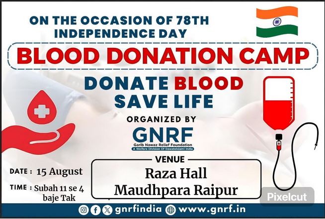 गरीब नवाज रिलीफ फाउंडेशन (GNRF) ने 78वें स्वतंत्रता दिवस के शुभ अवसर पर एक विशेष रक्तदान शिविर का आयोजन किया है। इस शिविर का मुख्य उद्देश्य “रक्तदान करें, जीवन बचाएं” है।