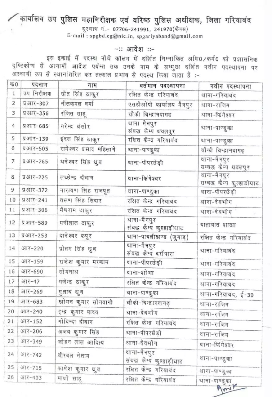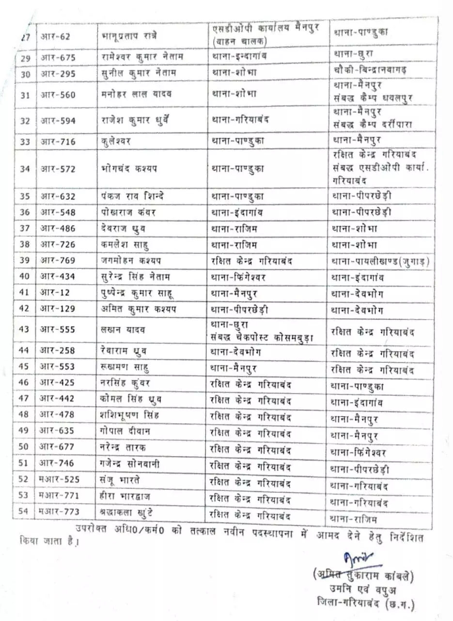 गरियाबंद :- पुलिस विभाग में तबादलों का दौर जारी है। रायपुर संभाग के और जिले से पुलिस विभाग में तबादला आदेश जारी किया गया है। गरियाबंद में एक साथ 54 पुलिसकर्मियों का ट्रांसफर, SP ने जारी किया आदेश लिस्ट जारी हुई है।54 पुलिसकर्मियों में 13 हेड कांस्टेबल और 41 आरक्षक शामिल हैं। एसपी अमित तुकाराम काम्बले ने आदेश जारी किया है।