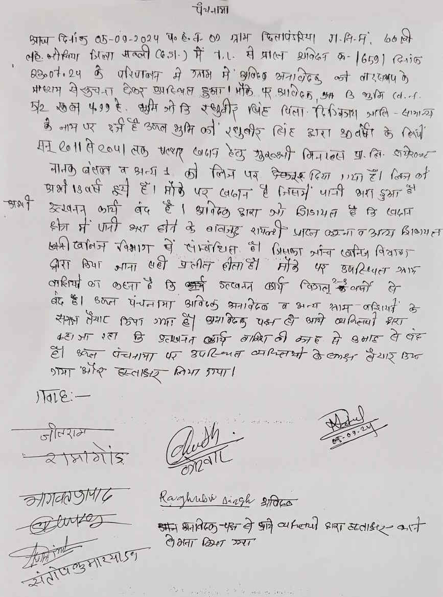 सक्ती :- सक्ती जिले में नियम विरुद्ध डोलोमाइट उत्खनन के शिकायत मामले में क्रेशर संचालक गुरुश्री मिनरल्स को संरक्षण देने और जांच रिपोर्ट बनाने वाले खनिज विभाग के अधिकारी घिरते नजर आ रहे हैं. मौका जांच के लिए छीता पंडरिया गांव पहुंचे पटवारी के सामने दिया गया ग्रामीणों का बयान जांच रिपोर्ट देने वाले अधिकारियों को कटघरे में खड़ा कर रहा है. जानकारी के अनुसार, गुरुश्री मिनरल्स के खसरा नंबर 5/2 माइंस की वर्तमान स्थिति की ग्रामीणों ने पटवारी को बताया है कि उक्त माइंस पिछले 2 से 3 सालों से बंद पड़ी है. ग्रामीणों के बयान और पटवारी के पंचनामा रिपोर्ट के बाद खनिज विभाग के अधिकारियों की उस जांच रिपोर्ट पर सवाल खड़ा कर दिया है.
