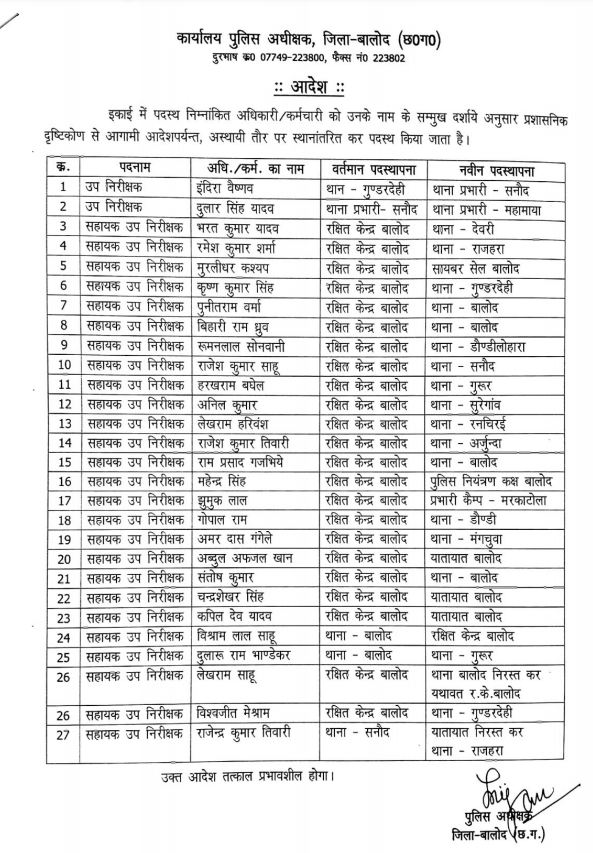 बालोद :- छत्तीसगढ़ में दीपावली पर्व के पहले तबादलों का सिलसिला जारी है। इसी कड़ी में जिले के एसपी ने रक्षित केंद्र और विभिन्न थानों में लंबे समय से पदस्थ पुलिसकर्मियों का थोक में तबादला कर दिया है। एसपी कार्यालय से जारी इस आदेश में 2 उप निरीक्षक और 25 सहायक उप निरीक्षकों का नाम शामिल है।