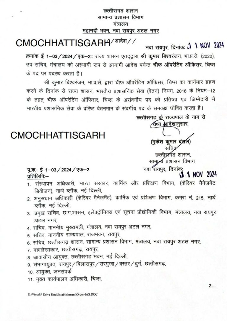 रायपुर :- छत्तीसगढ़ शासन ने भारतीय प्रशासनिक सेवा बैच 2020 के IAS कुमार बिश्वरंजन को छत्तीसगढ़ इन्फोटेक प्रमोशन सोसाइटी (CHiPS) के चीफ ऑपरेटिंग ऑफिसर की जिम्मेदारी सौंपी है. आज मंत्रालय के सामान्य प्रशासन विभाग की ओर से उनकी पदस्थापना का आदेश जारी किया गया है.
