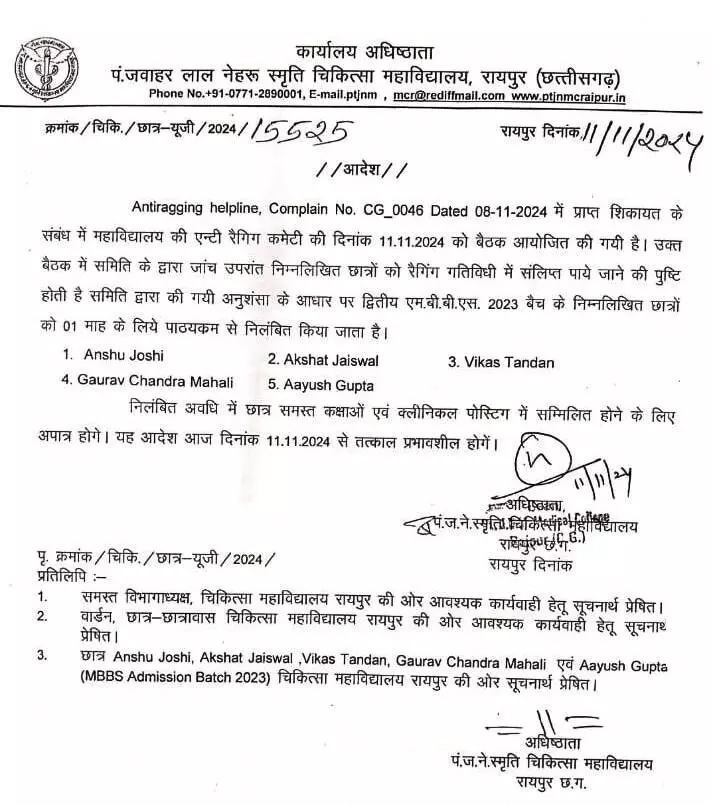 रायपुर :- रैगिंग के मामले में पंडित जवाहर लाल नेहरू मेमोरियल मेडिकल कॉलेज में एमबीबीएस के सेकंड ईयर के पांच छात्रों को निलंबित कर दिया गया है. 2023 बैच के पांच छात्रों एक महीने तक कक्षाओं और क्लीनिक पोस्टिंग में शामिल नहीं होंगे. यह कार्रवाई एंटी रैगिंग कमेटी में सुनवाई के बाद हुई है. पं. जवाहर लाल नेहरू स्मृति चिकित्सा महाविद्यालय में अध्ययनरत जिन सेकंड ईयर के छात्रों के खिलाफ कार्रवाई की गई है, उनमें अंशु जोशी, अक्षत जायसवाल, विकास टंडन, गौरव चंद्र महाली और आयुष गुप्ता शामिल हैं. इस संबंध में चिकित्सा महाविद्यालय के कार्यालय अधिष्ठाता की ओर से पत्र जारी किया गया है.