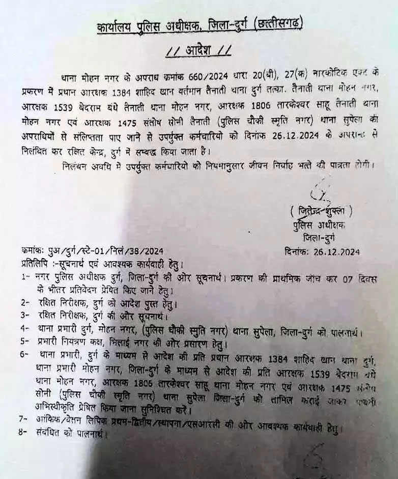 इन खाकी वर्दीधारियों पर नशे के सौदागरों से गहरे ताल्लुकात रखने का आरोप है. निलंबन अवधि के दौरान इन्हें नियमानुसार जीवन निर्वाह भत्ता मिलता रहेगा। पुलिस अधीक्षक जितेंद्र शुक्ला की इस कार्रवाई से भिलाई-दुर्ग पुलिस महकमे में हड़कंप मचा हुआ है. पुलिस अधीक्षक जितेंद्र शुक्ला ने निलंबन की कार्रवाई के साथ नशे के सौदागरों से गहरे ताल्लुकात के जांच के आदेश दे दिए हैं. दुर्ग नगर पुलिस अधीक्षक एक सप्ताह के भीतर इस मामले की जांच कर प्रतिवेदन पुलिस अधीक्षक के समक्ष प्रस्तुत करेंगे।