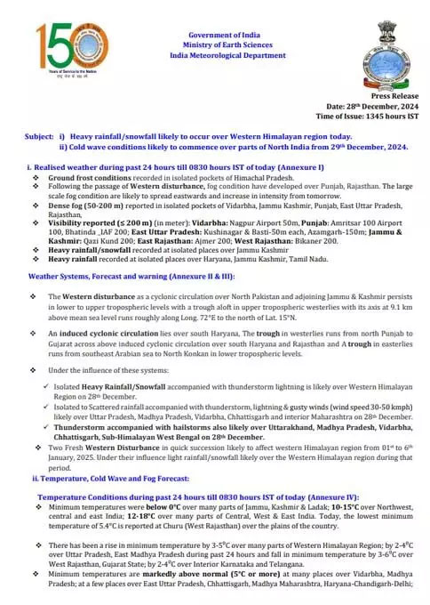 रायपुर :- प्रदेश में आज अधिकांश जिलों में बदली छाई रही और कवर्धा, गौरेला पेंड्रा और आसपास के कल जिलों में बारिश हुई। कल 29 दिसंबर को मौसम मुख्यतः शुष्क रहने और न्यूनतम तापमान में गिरावट का दौर प्रारंभ होने की संभावना है। 2 जनवरी तक प्रदेश के अधिकांश भाग में न्यूनतम तापमान में 6-8 डिग्री तापमान में गिरावट संभावित है। उत्तर छत्तीसगढ में 1 जनवरी से कुछ पैकेट में शीतलहर चल सकती है।