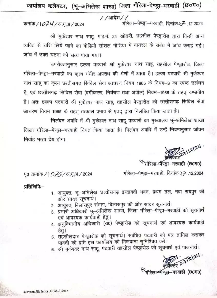 वायरल वीडियो में पटवारी रकम लेता हुआ दिखाई दिए थे। इसके पहले भी पटवारी मुकेश्वर नाथ साहू के खिलाफ निवास, जाति, आय, फौती नामांतरण आदि के प्रतिवेदन बनाने में भी रिश्वत मांगने की शिकायतें मिली थी। कलेक्टर द्वारा जांच में घटना सहीं पाई गई। हल्का पटवारी मुकेश्वरनाथ साहू तहसील पेंड्रा रोड के कृत्य को गंभीर अपराध की श्रेणी में माना गया। पटवारी के उक्त कृत्य को छत्तीसगढ़ सिविल सेवा आचरण नियम 1965 के नियम 3 का स्पष्ट उल्लंघन पाते हुए छत्तीसगढ़ सिविल सेवा वर्गीकरण नियंत्रण तथा अपील नियम 1966 के तहत दंडनीय अपराध होने के चलते तत्काल प्रभाव से निलंबित कर दिया गया। निलंबन अवधि में पटवारी का मुख्यालय भू अभिलेख शाखा जिला गौरेला पेंड्रा मरवाही नियत किया गया।