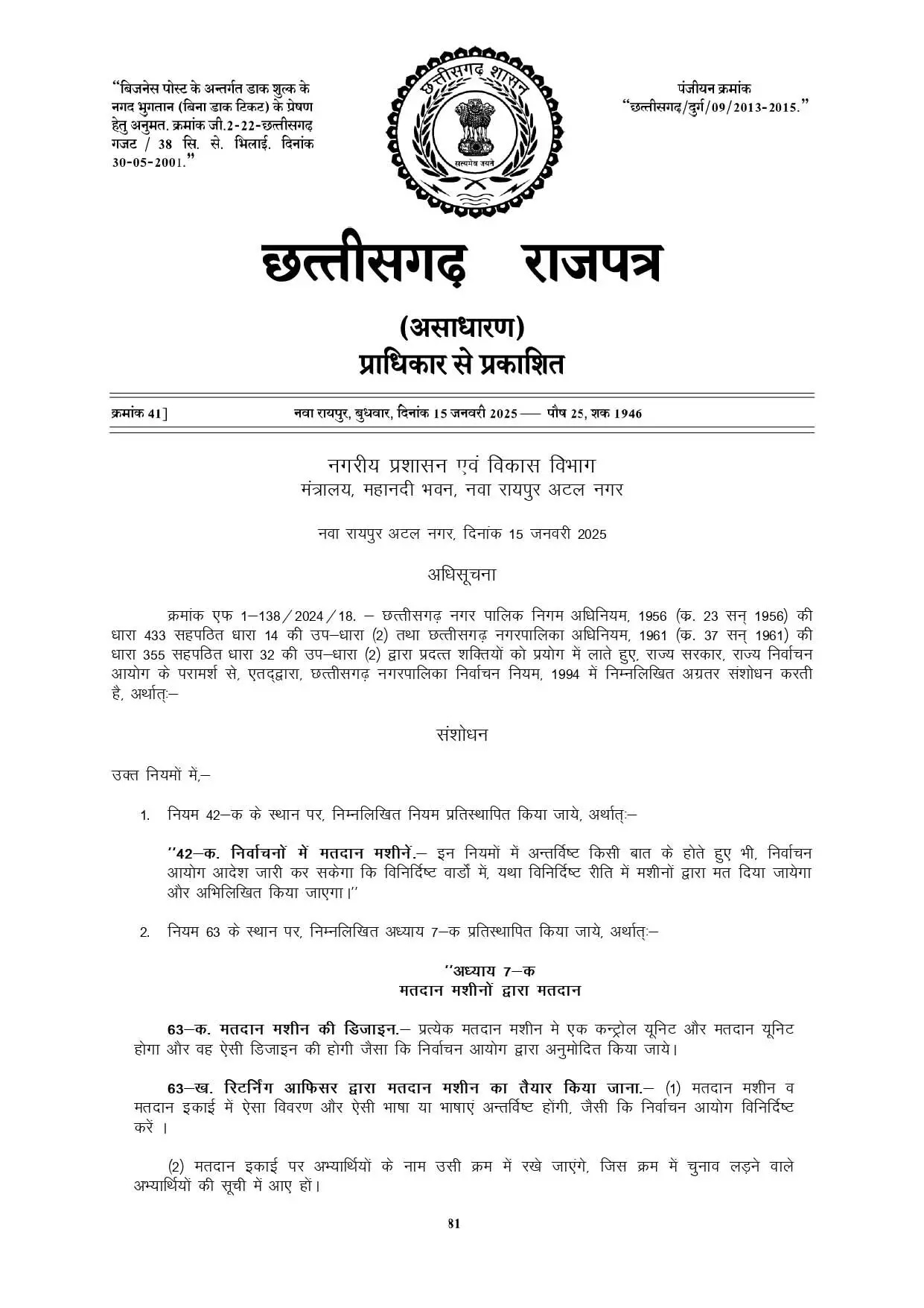 रायपुर :- नगरीय प्रशासन विभाग ने निकाय चुनाव में होने वाले ईवीएम से मतदान को लेकर विस्तृत दिशा निर्देश अधिसूचित किया है।