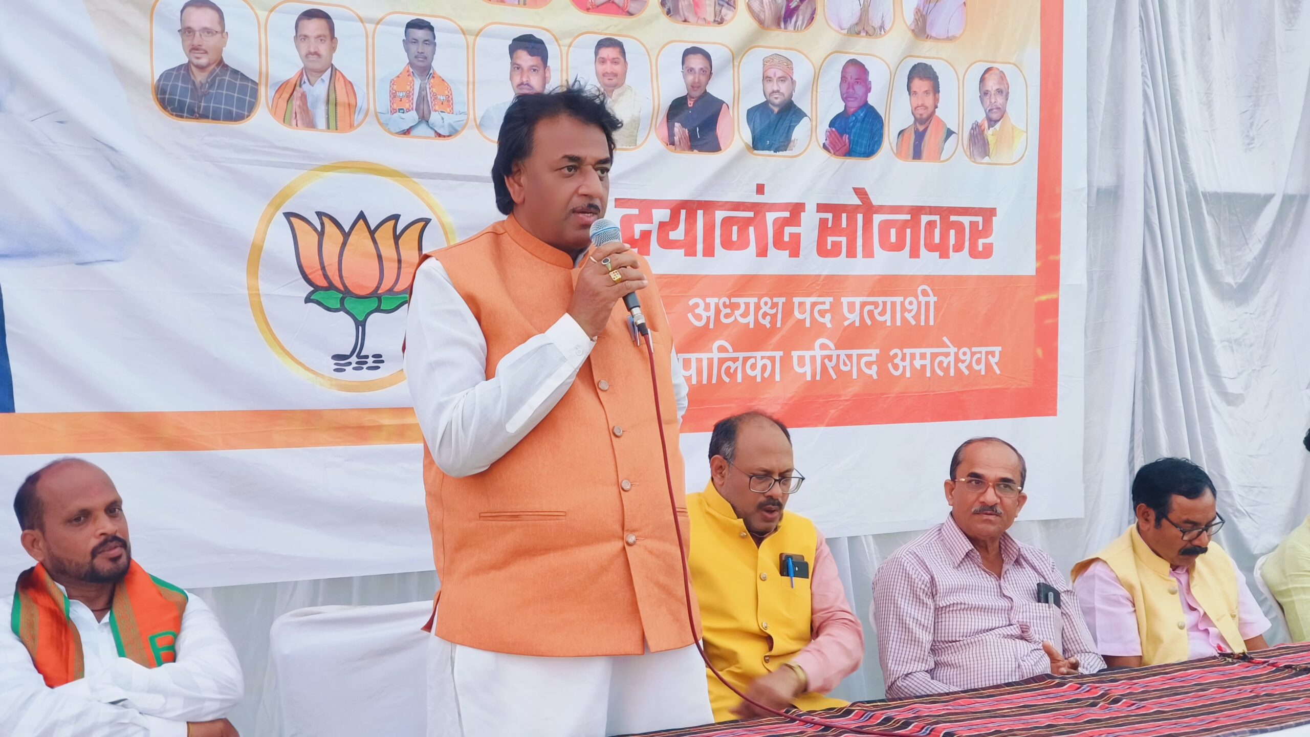 अध्यक्ष प्रत्याशी दयानंद सोनकर ने कहा कि वे क्षेत्र के लिए सतत समर्पित रहे है एवं क्षेत्र के हर घर एवं हर व्यक्ति से उनके लगाव के बारे में बताया। उन्होंने इशारों इशारों में ही कहा मेरी प्रवृति तोड़ने वाली नहीं जोड़ने वाली है, अमलेश्वर के विकास के लिए उन्होंने भाजपा को वोट देने की अपील की। बैठक में लोकमणी चन्द्राकार, हर्षा चंद्राकर, खिलावन वर्मा, राजेश चंद्राकर, उत्तरा सोनवानी, डॉक्टर घनश्याम कौशिक, समाजसेवी पवन खंडेलवाल, सुरेंद्र साहू, मोहन साहू कुलदीप बैसवाड़े सहित कई नेता मौजूद रहे। सम्मेलन का संचालन अमलेश्वर नपा चुनाव संचालक कैलाश यादव जी ने किया एवं आभार धर्मेंद्र सोनकर ने जताया।