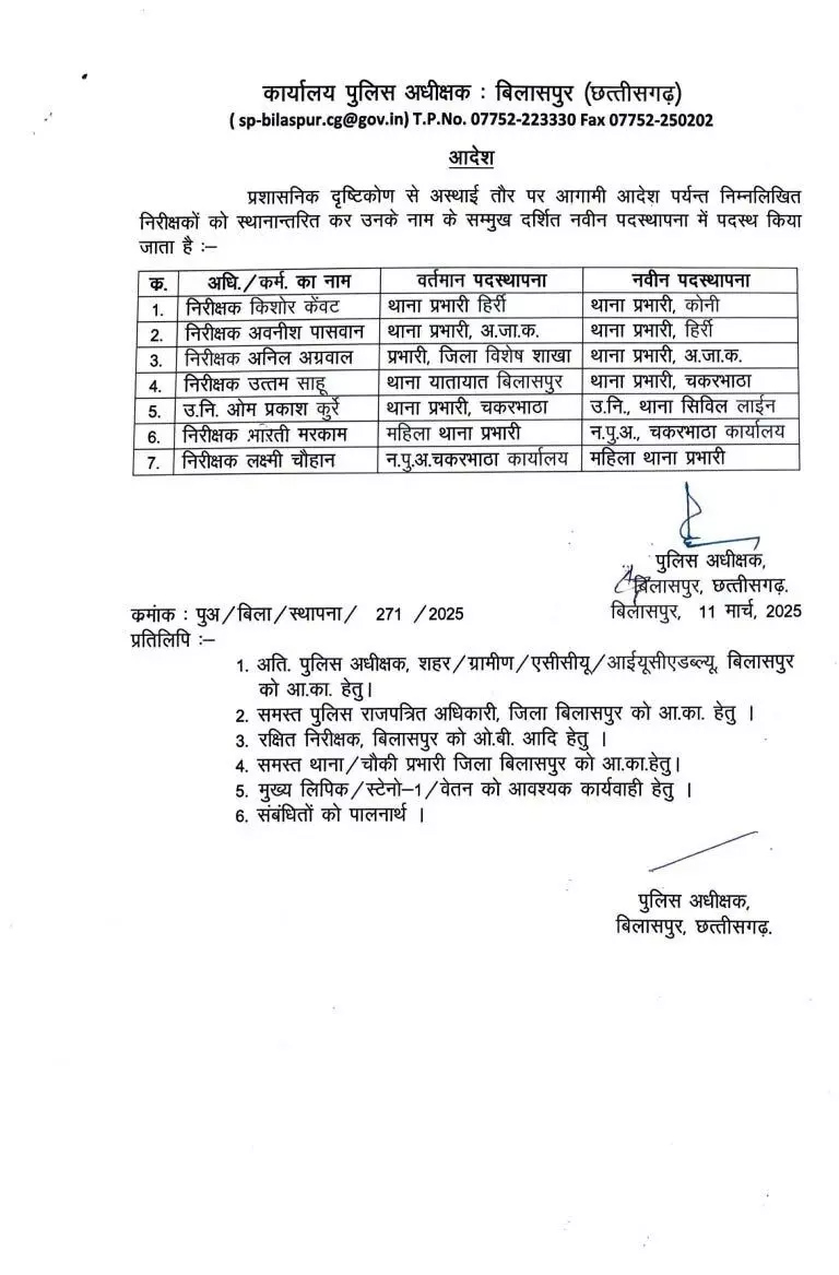 बिलासपुर :- कानून व्यवस्था पर कसावट लाने जिले के 7 थाना प्रभारियों का तबादला किया गया है. इसका आदेश एसपी रजनेश सिंह ने जारी किया. कोनी थाना प्रभारी नवीन देवांगन को सस्पेंड किए जाने के बाद थाना प्रभारियों का ट्रांसफर किया गया है.