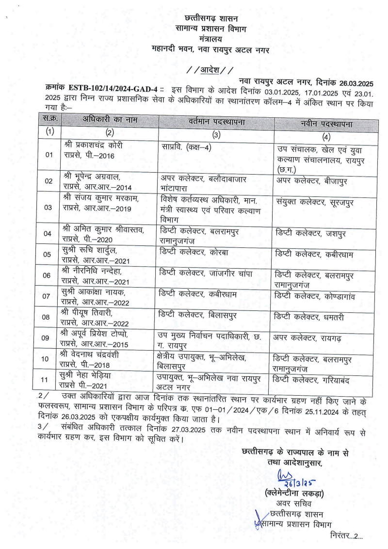रायपुर :- छत्तीसगढ़ सरकार द्वारा 26 मार्च 2025 को राज्य प्रशासनिक सेवा के 11 अधिकारियों के स्थानांतरण के आदेश जारी किए गए। इस आदेश के तहत विभिन्न जिलों में तैनात डिप्टी कलेक्टर, अपर कलेक्टर और अन्य प्रशासनिक अधिकारियों की नवीन पदस्थापना की गई है। आदेश के अनुसार, प्रकाशचंद्र कोरी को उप संचालक, खेल एवं युवा कल्याण संचालनालय, रायपुर नियुक्त किया गया है। वहीं, गुफरान अयूब को बलौदाबाजार से बीजापुर में अपर कलेक्टर के रूप में स्थानांतरित किया गया है।