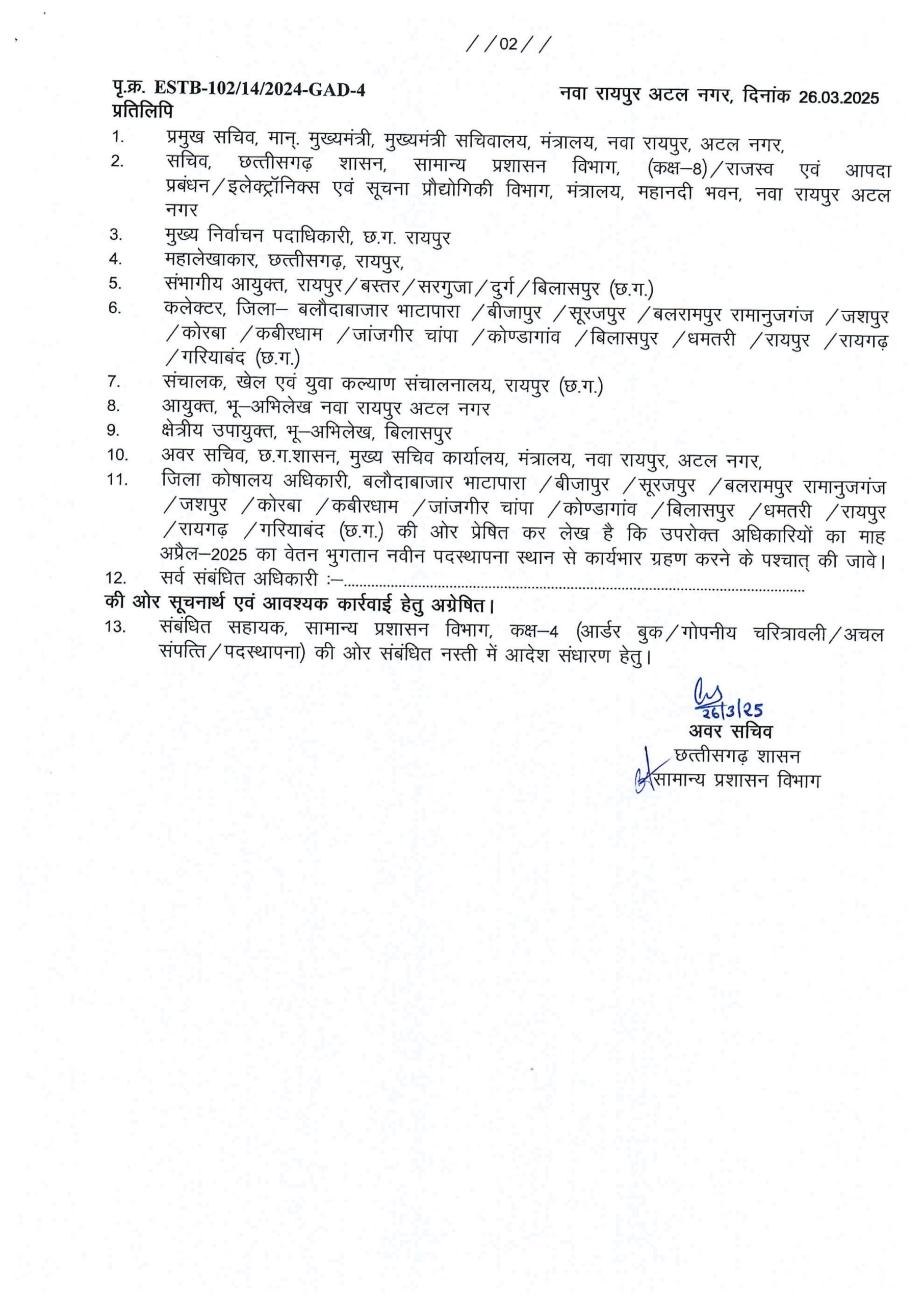 प्रकाशचंद्र कोरी को उप संचालक, खेल एवं युवा कल्याण संचालनालय, रायपुर नियुक्त किया गया। गुफरान अयूब को अपर कलेक्टर, बलौदाबाजार से अपर कलेक्टर, बीजापुर स्थानांतरित किया गया। संजय कुमार मरकाम को विशेष कर्तव्यस्थ अधिकारी (स्वास्थ्य एवं परिवार कल्याण विभाग) से संयुक्त कलेक्टर, सूरजपुर नियुक्त किया गया। अन्य अधिकारियों को भी विभिन्न जिलों के डिप्टी कलेक्टर, अपर कलेक्टर और उप संचालक पदों पर पदस्थ किया गया। इसके अतिरिक्त, आदेश में यह भी स्पष्ट किया गया है कि स्थानांतरित अधिकारियों को 26 मार्च 2025 को नवीन पदस्थापना पर अनिवार्य रूप से कार्यभार ग्रहण करना होगा।