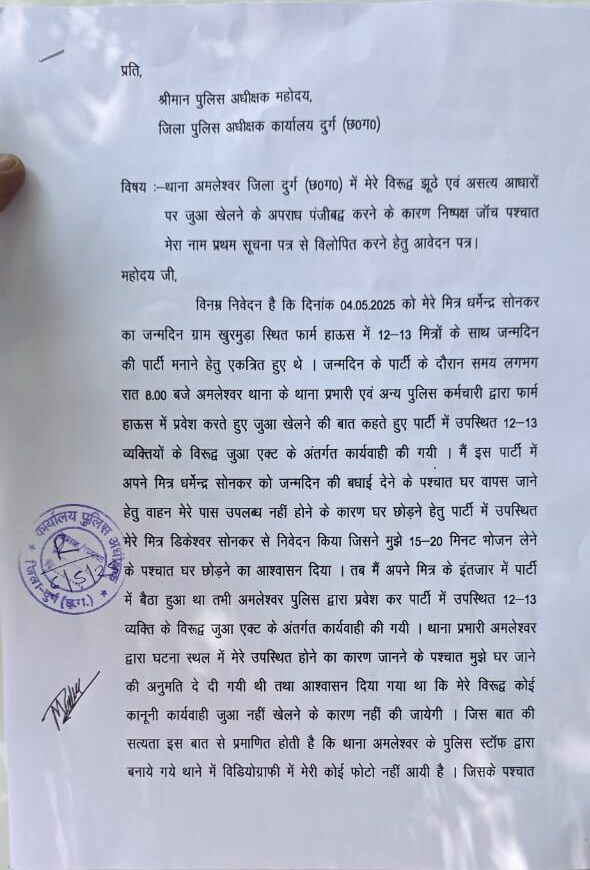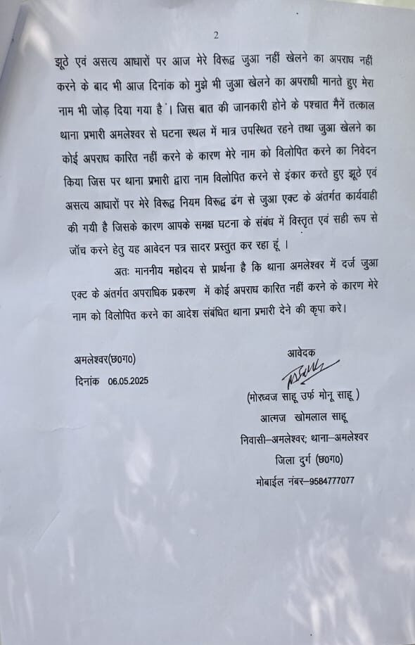 काला सच न्यूज़, अम्लेश्वर। पूर्व जिला पंचायत सभापति मोनू साहू ने एक प्रेस विज्ञप्ति जारी कर कहा है कि 04 मई को जुआ एक्ट के तहत पुलिस ने जो 14 लोगों को पर कार्यवाही की गई है। उसमें मेरे नाम को बेवजह जोड़ा गया है।जिसकी शिकायत आज 06 मई को पुलिस अधीक्षक कार्यालय में की गई है। जिसमे उन्होंने निष्पक्ष जांच की मांग की है।