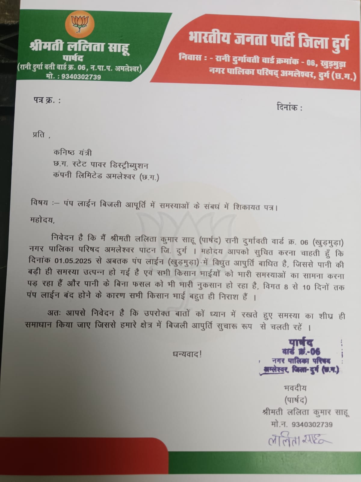 इस संबंध में पार्षद और आसपास के लोगों ने एक ज्ञापन भी विद्युत विभाग को दिया है। जिसमे कुमार साहू पार्षद प्रतिनिधि, दीपक घिडोड़े पार्षद, चिंतामणी सोनकर, सोहन निषाद, लीलाधर सोनकर ,मनहरान सोनकर, देवकुमार सोनकर, हेमकुमार सोनकर, मनी राम साहू व ग्रामीण लोग मौजूद थे।