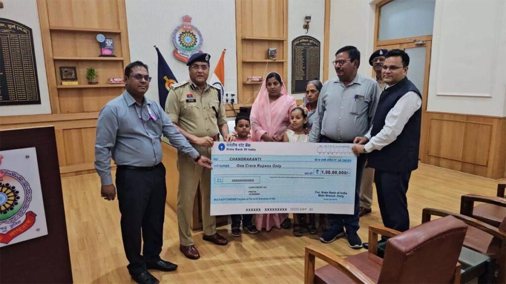 दुर्ग :- सड़क दुर्घटना में असामयिक रूप से दिवंगत हुए पुलिस आरक्षक उपेन्द्र कुमार तिवारी (आरक्षक क्र. 1724) के परिजनों को पुलिस सैलेरी पैकेज (P.S.P.) दुर्घटना मृत्यु दावा के अंतर्गत 1 करोड़ रुपये का मुआवजा प्रदान किया गया। यह राशि उनकी नामिनी व माताजी चंद्रकांति तिवारी को सौंपी गई।