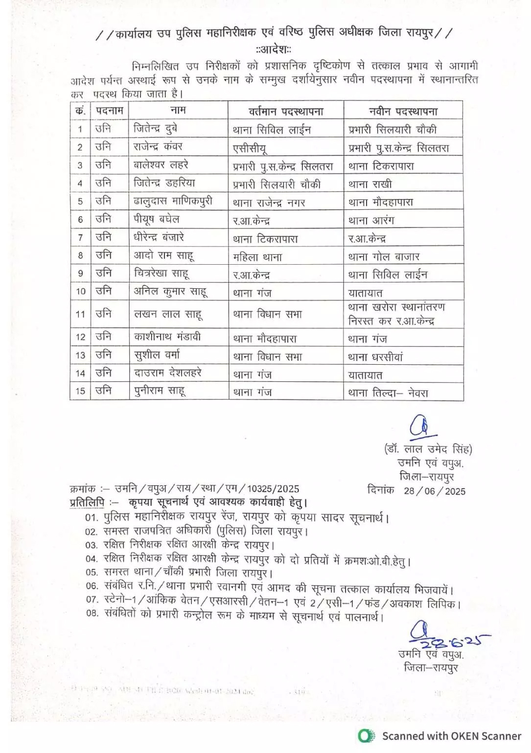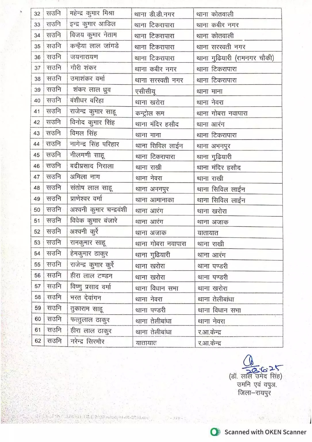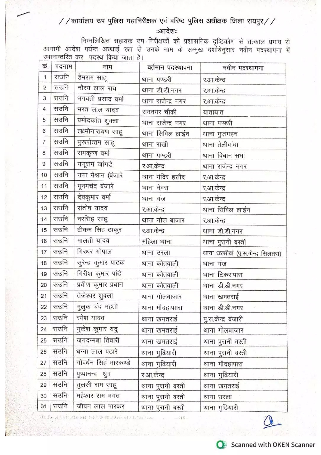 रायपुर :- जिले के पुलिस विभाग में तबादला हुआ है. प्रशासनिक दृष्टिकोण से बड़ी संख्या में सब इंस्पेटर और असिस्टेंट सब इंस्पेटर इधर से उधर हुए हैं. इस संबंध में रायपुर SSP डॉ. लाल उमेद सिंह ने आदेश जारी किया है. जारी लिस्ट में कुल 77 पुलिस अधिकारियों के नाम शामिल है. ट्रांसफर में शामिल कई अधिकारी पिछले कई सालों से एक ही थाने में जमे हुए थे.
