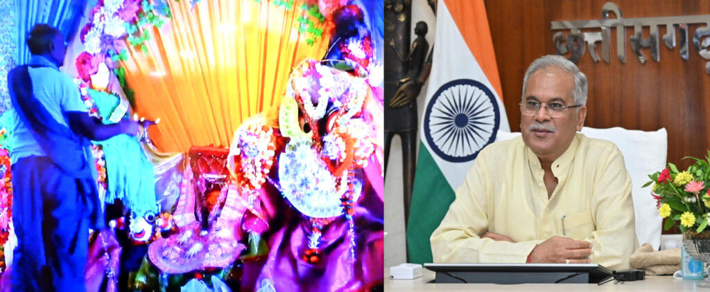 मुख्यमंत्री श्री भूपेश बघेल आज यहां अपने निवास कार्यालय से बस्तर जिले के जगदलपुर स्थित सिरहासार भवन में आयोजित ‘बस्तर गोंचा महापर्व’ और भगवान श्री जगन्नाथ की आरती एवं 56 भोग कार्यक्रम में वर्चुअली शामिल हुए। मुख्यमंत्री श्री बघेल ने भगवान जगन्नाथ से प्रदेशवासियों के सुख-समृद्धि और खुशहाली की कामना की और सभी को गोंचा महापर्व की शुभकामनाएं दीं। गौरतलब है कि बस्तर में यह महापर्व 04 जून से 28 जून 2023 तक आयोजित हो रहा है।