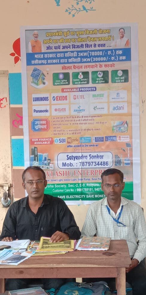 पाटन। सांकरा। अम्लेश्वर के सांकरा में विगत दिनो शिविर लगाकर प्रधानमंत्री सूर्य घर मुफ्त बिजली योजना के अंतर्गत वेंडर – अवि आशु इंटरप्रईजेस रायपुर के द्वारा धमतरी, गरियाबंद, महासमुंद, दुर्ग , बेमेतरा, बिलासपुर व अन्य जिलों मे योजना की जानकारी प्रदान कर सौर ऊर्जा पेनल लगाकर लोगोँ को योजना का लाभ दिलाया जा रहा है।