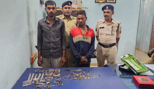 राजधानी के आरंग थाना क्षेत्र के ग्राम भानसोज में रहने वाले प्रधानपाठक के सूने मकान में दिनदहाड़े चोरी करने वाले दो आरोपियों को पुलिस ने गिरफ्तार किया है। पुलिस ने आरोपियों के पास से चोरी के सोने-चांदी के जेवर जब्त किए है। जिसकी कीमत करीब 6 लाख रूपए के आसपास बताई जा रही है। बता दें कि ग्राम भानसोज निवासी हरिशंकर कुर्रे ग्राम डिहरी के शासकीय स्कूल में प्रधानपाठक के पद पर कार्यरत् है। हरिशंकर की पत्नी भी उक्त स्कूल में ही उच्च शिक्षक के पद पर पदस्थ है। बताया जाता है कि 28 जून को दोनों पति-पत्नी अपने पुत्र के साथ घर में ताला लगाकर स्कूल गए थे। जब दोपहर में उसका पुत्र आया तो देखा कि घर का सारा सामान बिखरा हुआ है और आलमारी में रखे जेवर गायब है। जिससे हरिशंकर ने इसकी शिकायत थाने में की। मामले में पुलिस ने आरोपियों की पतासाजी कर ग्राम भानसोज निवासी डागेश्वर साहू 22 वर्ष को हिरासत में लेकर पूछताछ की। जिससे डागेश्वर ने बताया कि वह अपने साथी कन्हैया धीवर उर्फ डागा 21 वर्ष के साथ मिलकर चोरी की उक्त घटना को अंजाम दिया है। जिस पर टीम के सदस्यों द्वारा कन्हैया धीवर उर्फ डागा धीवर की भी पतासाजी कर पकड़ा गया। दोनों आरोपियों को गिरफ्तार कर उनके कब्जे से चोरी की संपूर्ण जेवर बरामद कर लिया है। जिसकी कीमत करीब 6 लाख रूपए के आसपास बताई जा रही है।